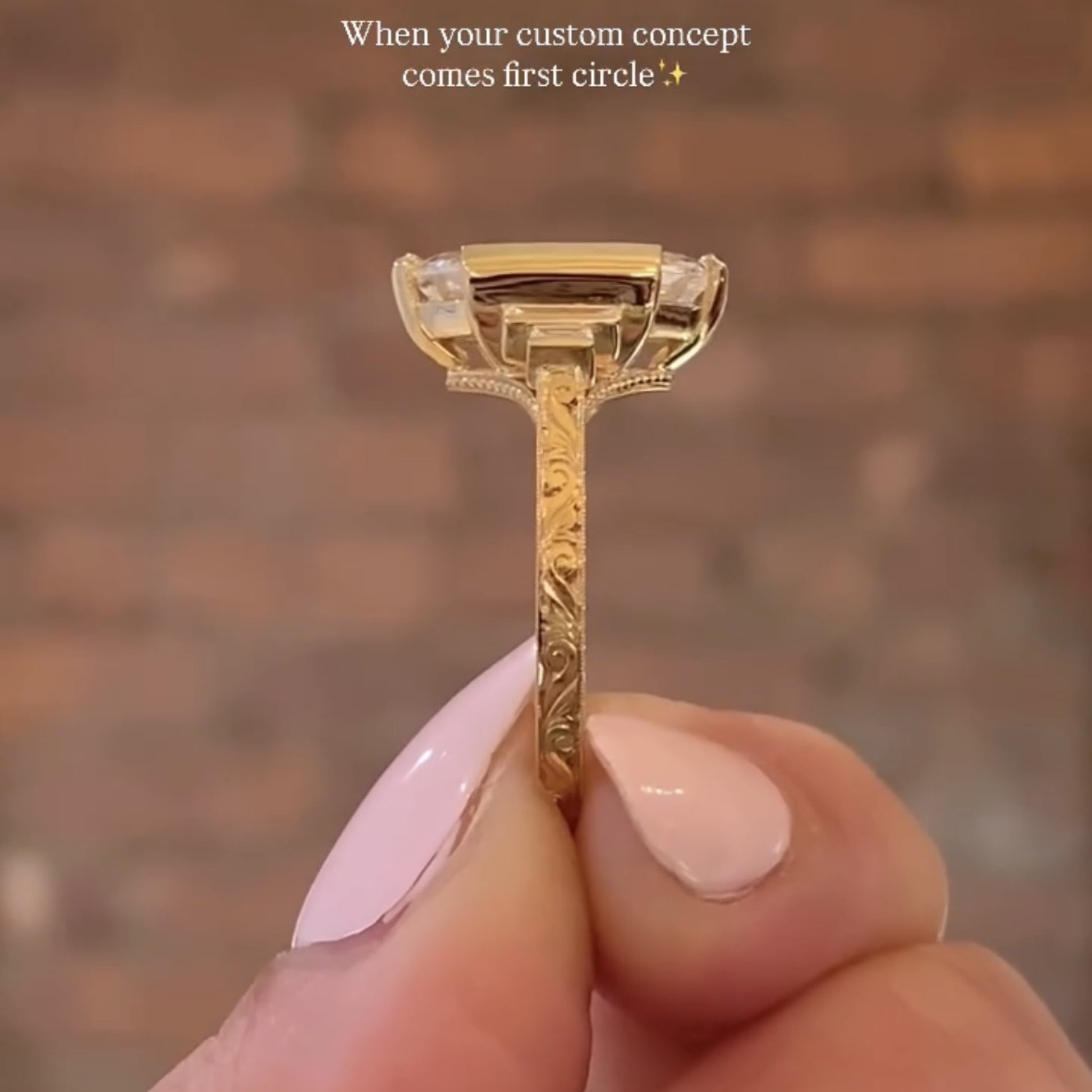 This striking half bezel hexagon lab grown diamond ring showcases bold geometry and refined craftsmanship. The elongated hexagon diamond is securely framed in a sleek half bezel setting, enhancing its clean lines and unique shape. Accented with step-cut side stones and an intricately engraved gold band, this ethical lab grown diamond ring offers architectural elegance, vintage-inspired detail, and a truly distinctive engagement or statement design.
