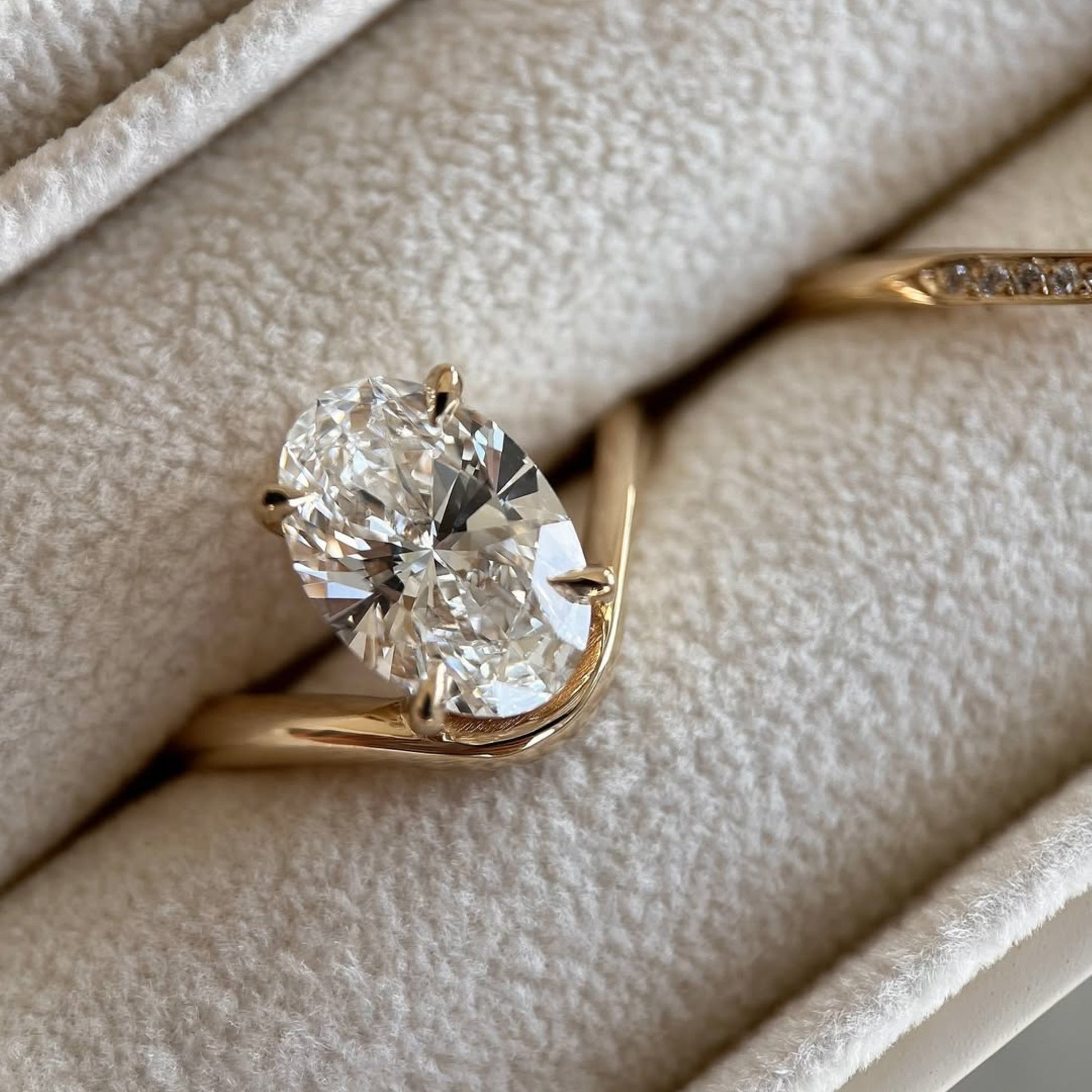This elegant oval cut lab grown engagement ring set features a brilliant center stone beautifully paired with a contoured curved wedding band. Designed to sit seamlessly together, the graceful wave band is accented with sparkling lab grown diamonds for added brilliance. Crafted for comfort and timeless style, this bridal set offers sustainable luxury, exceptional sparkle, and a modern yet romantic look perfect for everyday wear and forever moments.