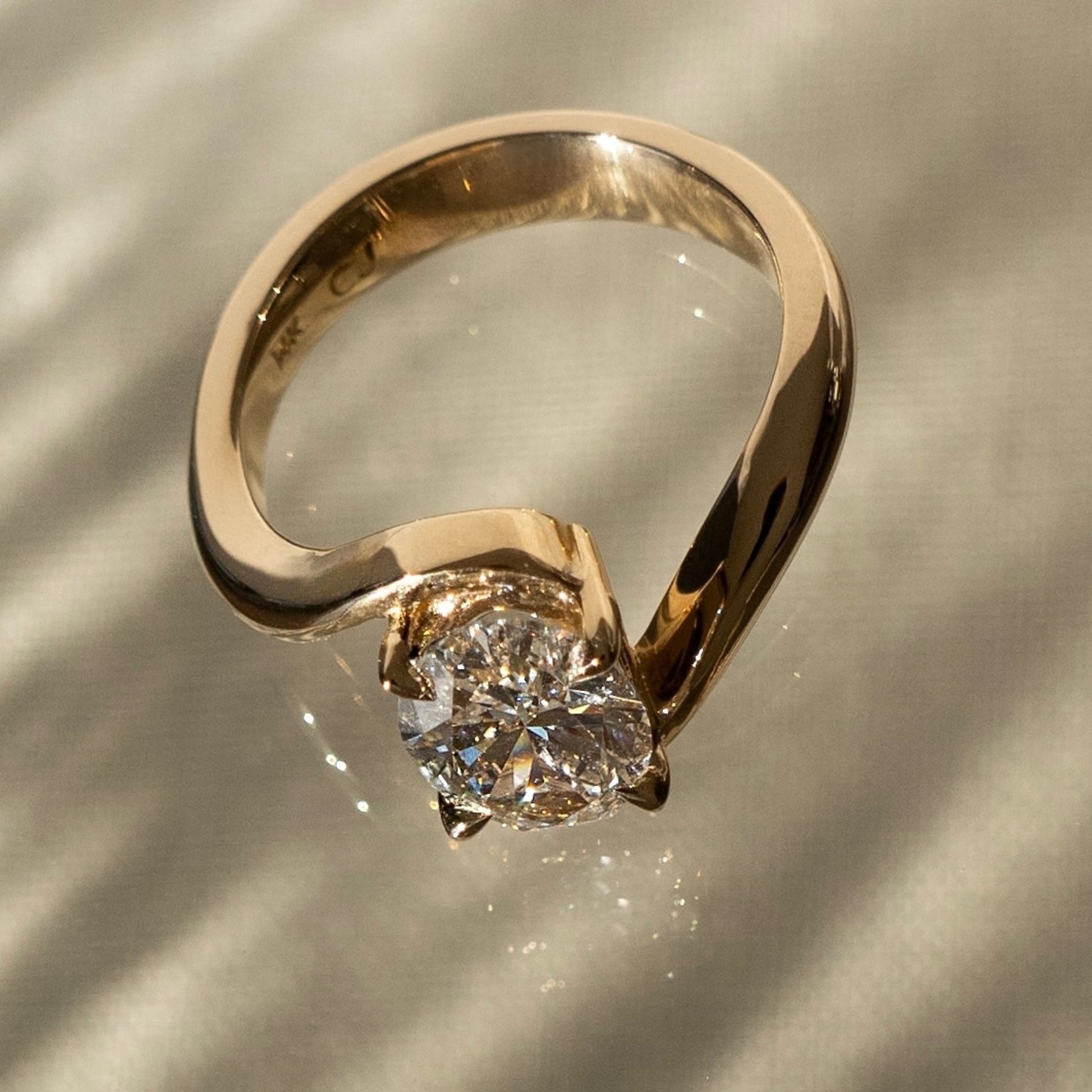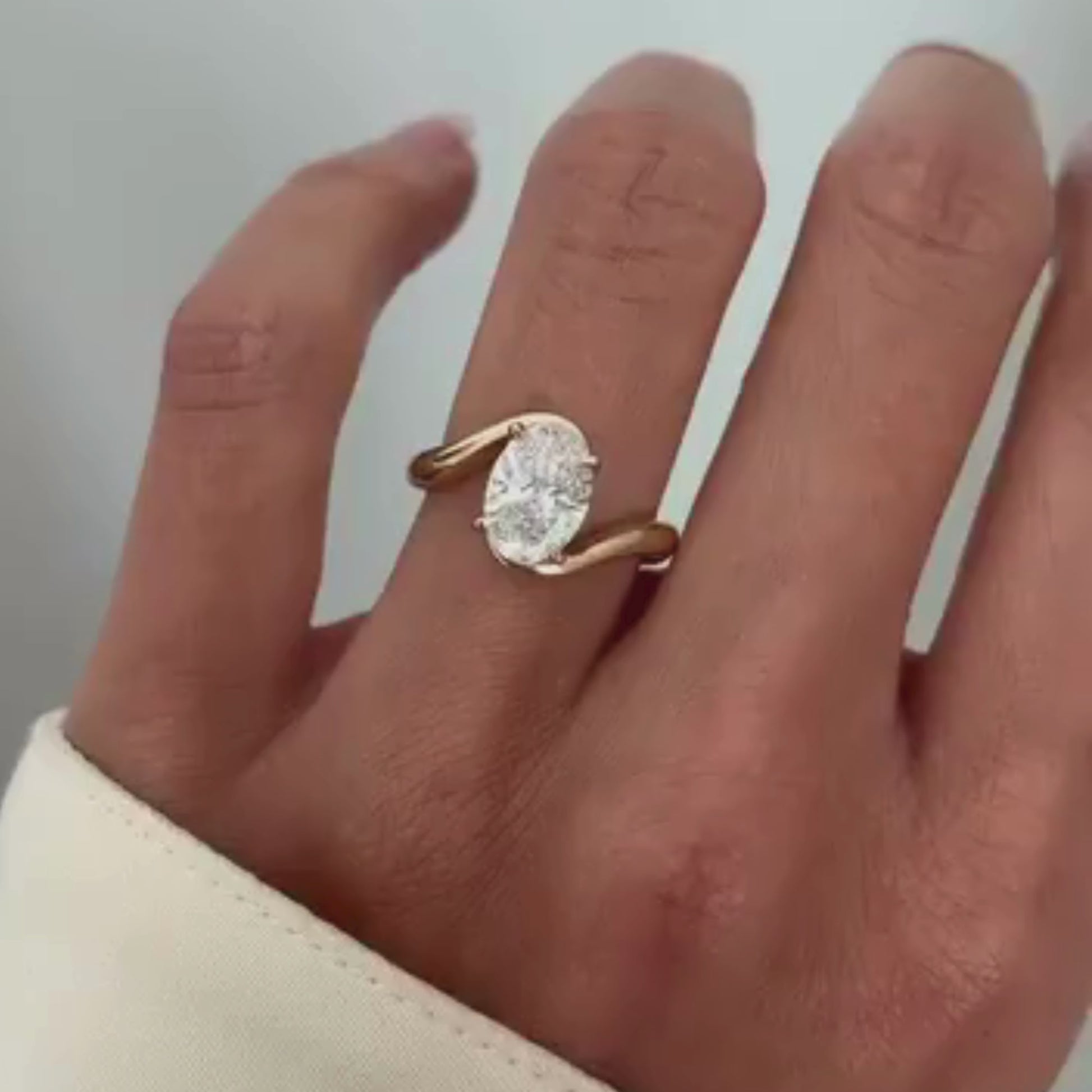 This modern bypass solitaire engagement ring showcases a radiant oval cut Moissanite diamond, gracefully embraced by a sculptural gold band. The flowing bypass design adds movement and elegance, drawing attention to the diamond’s exceptional brilliance and fire. Crafted with ethically sourced lab grown stones, this ring blends contemporary style with timeless romance, making it a perfect choice for engagements, weddings, or a meaningful forever promise.