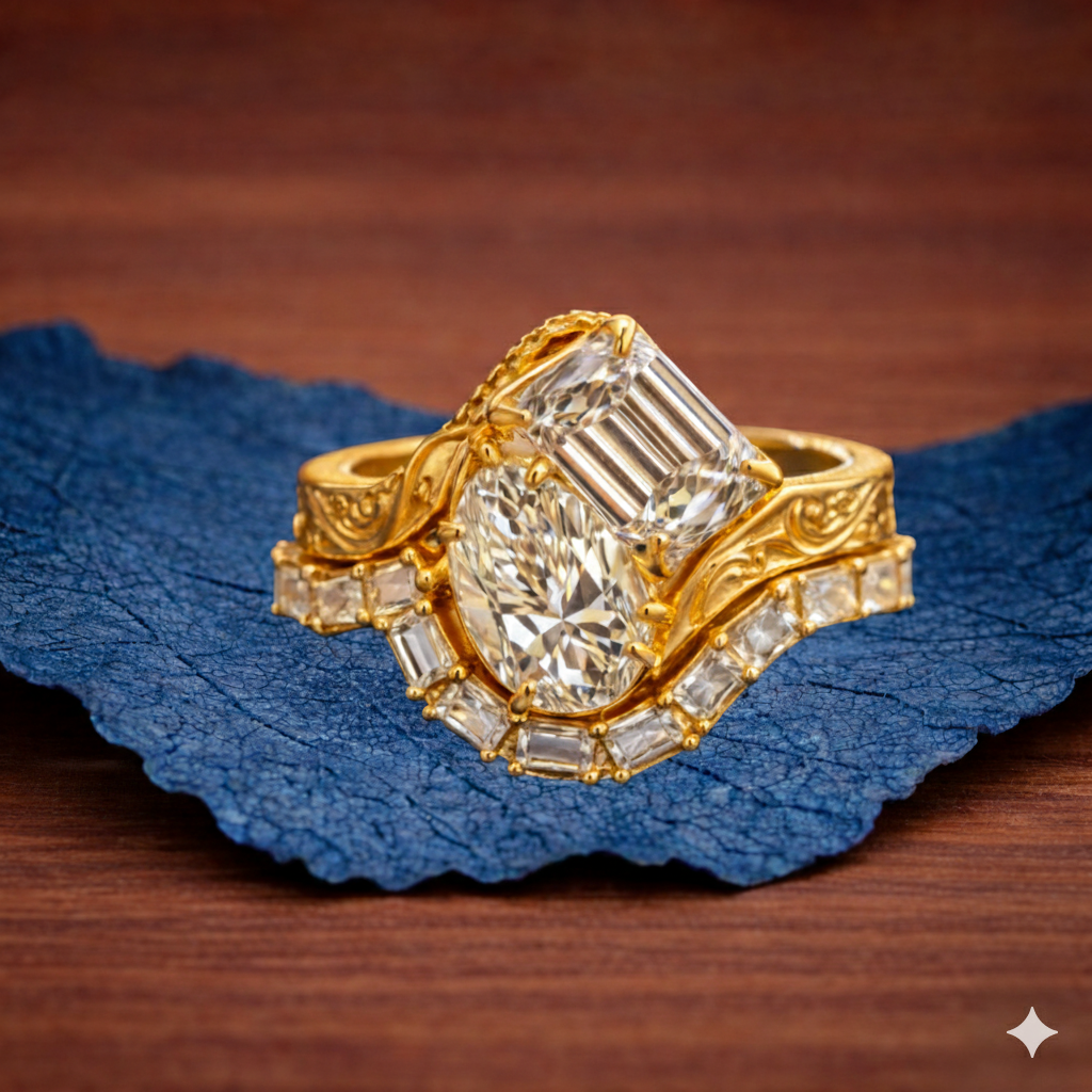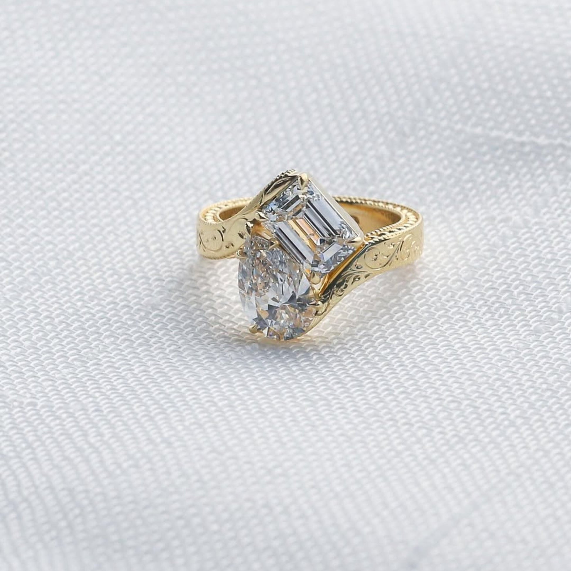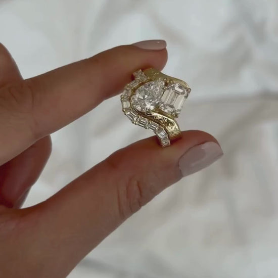 This stunning ring set features a captivating pear-cut and emerald-cut diamond duo, symbolizing two hearts intertwined. Designed in luminous yellow gold, the ring showcases vintage charm with refined Art Deco detailing and hand-engraved accents. Ethically crafted and endlessly elegant, this unique engagement and wedding ring set offers timeless luxury, bold character, and heirloom-inspired beauty for the modern bride..