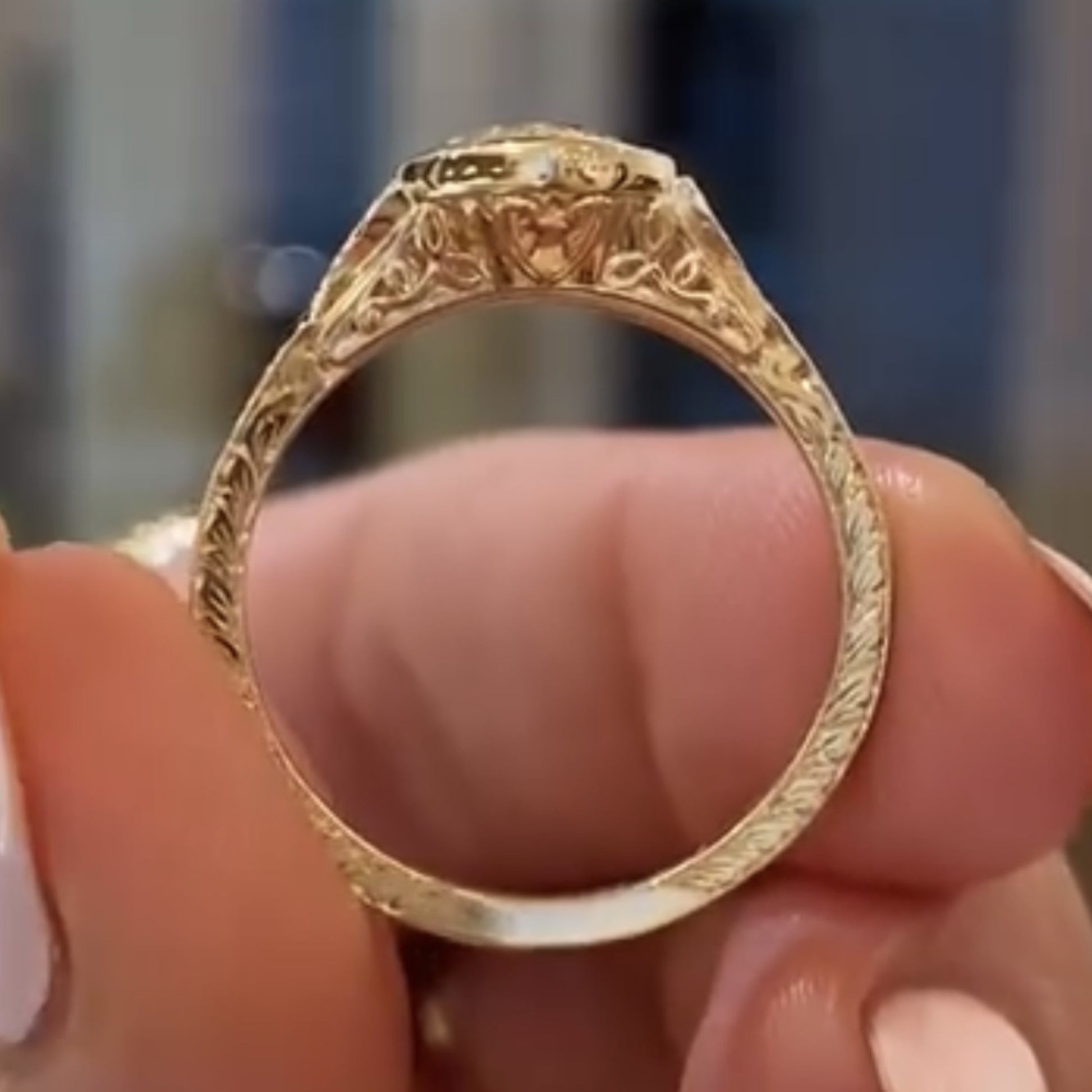 Celebrate refined vintage beauty with this ring, crafted in glowing gold. The elongated marquise lab grown diamond is framed in a sleek bezel, enhanced by intricate filigree, engraved details, and striking accent stones inspired by classic Art Deco design. Ethical, sustainable, and richly detailed, this vintage gold engagement ring offers timeless elegance with a bold, distinctive silhouette for modern romantics.