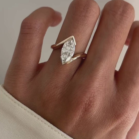 Half Bezel Set Marquise Cut Bypass Moissanite Engagement Ring in Solid Gold