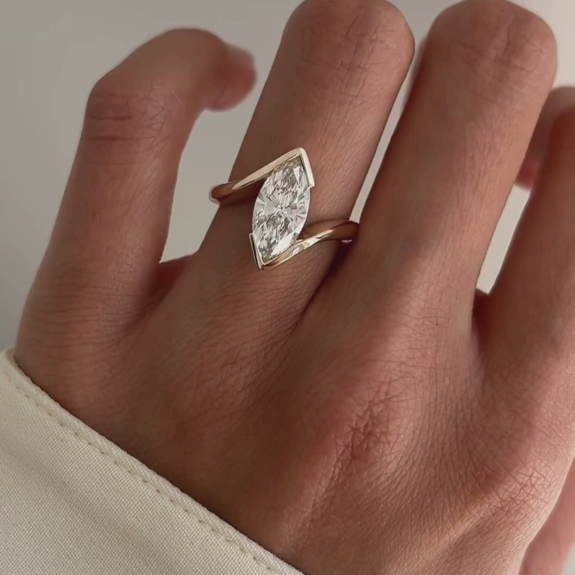 This half bezel set marquise cut Moissanite engagement ring features a sleek bypass design that elegantly wraps around the center stone. Crafted in solid gold, the elongated marquise shape enhances brilliance while the modern bezel offers security and style. Perfect as a wedding, anniversary, or promise ring, this timeless design blends contemporary sophistication with ethical luxury for women who love refined elegance.