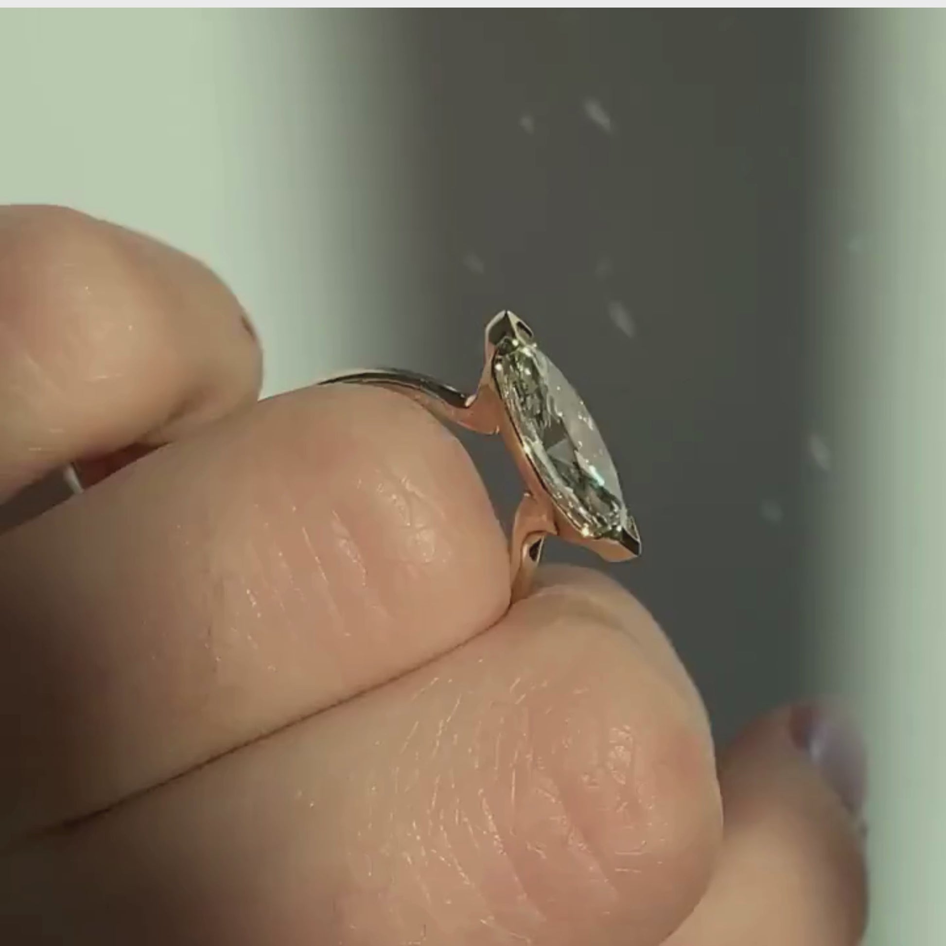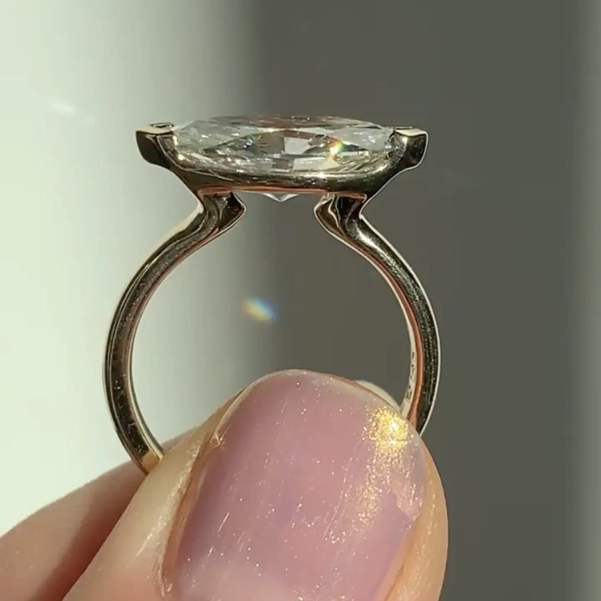 This striking engagement ring showcases a marquise-cut lab grown diamond set in a modern east-west orientation. Sleek V prongs securely cradle the stone, enhancing its elongated brilliance and contemporary appeal. Crafted in radiant gold, the minimalist band offers elegance and comfort. A perfect blend of bold design and refined craftsmanship, ideal for those seeking a unique, fashion-forward wedding or engagement ring.