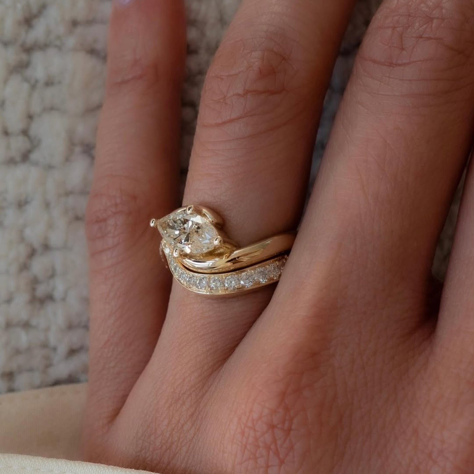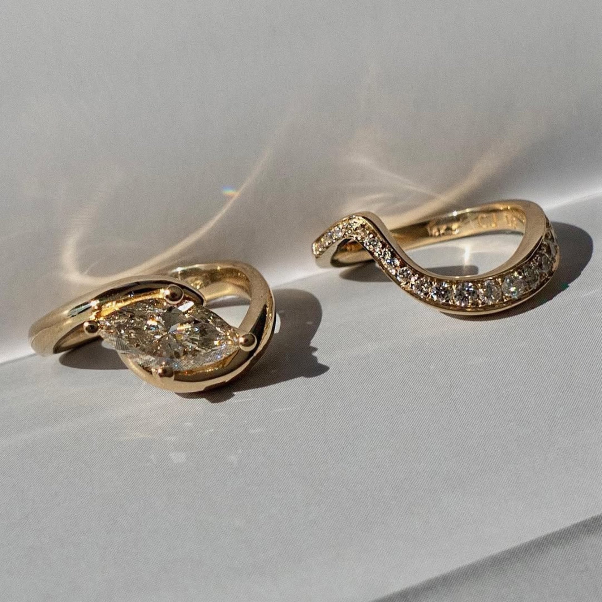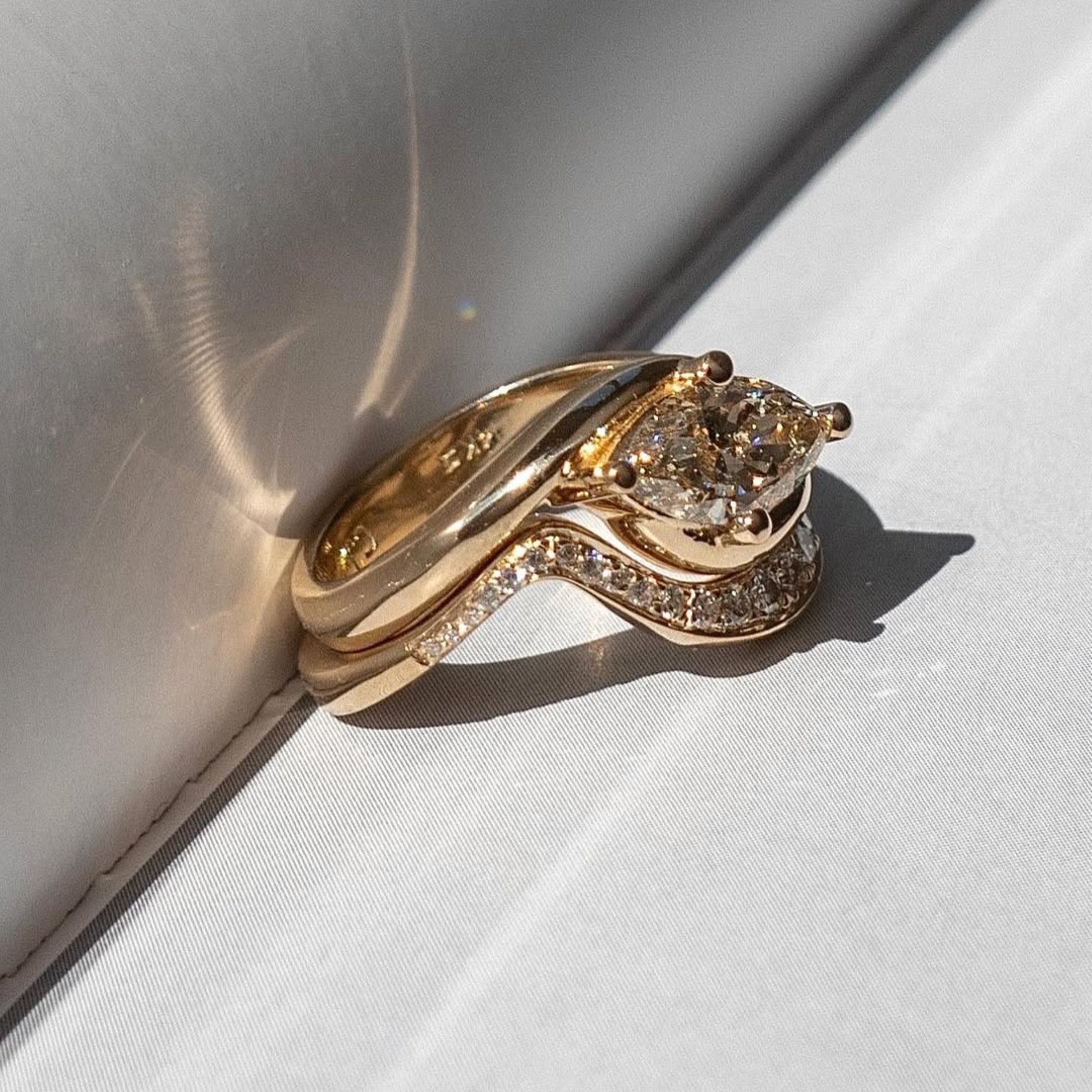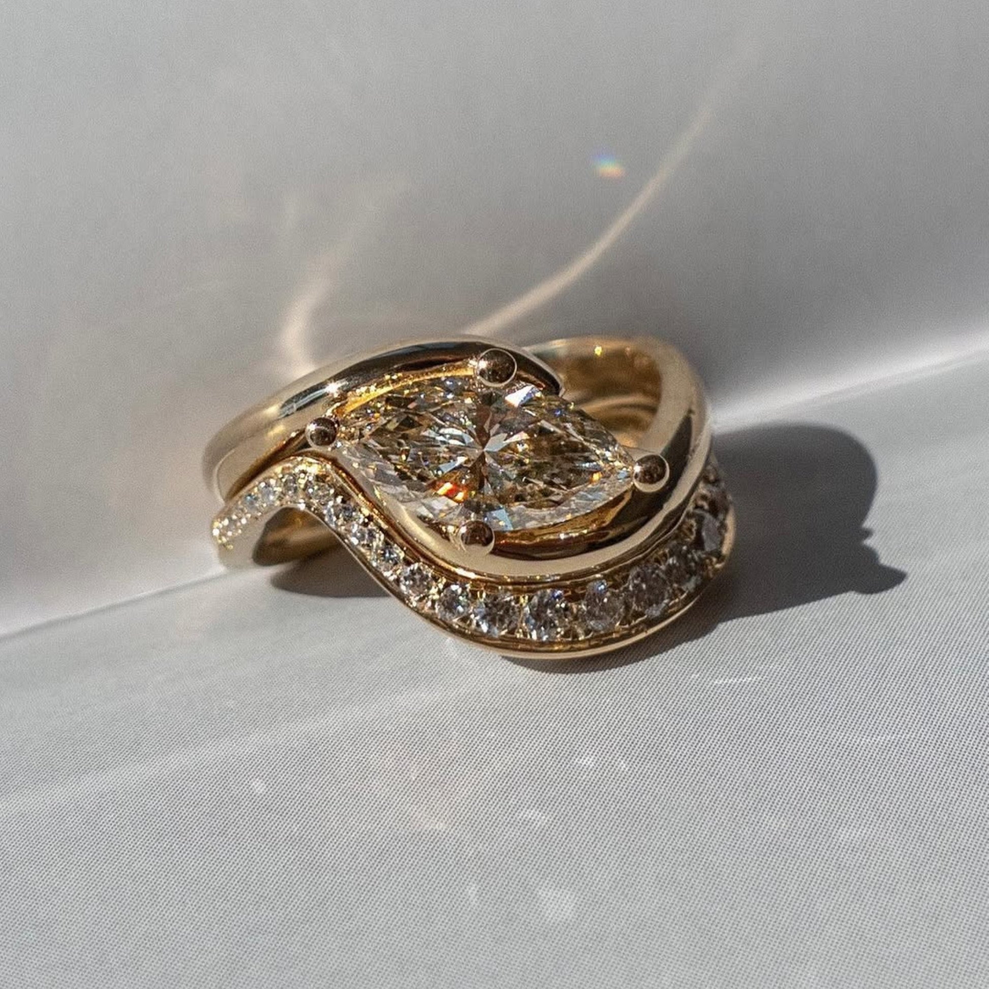 This elegant bridal ring set features a marquise cut Moissanite diamond set in a modern east west orientation, creating a bold yet graceful look. Crafted in warm gold, the sculpted engagement ring pairs beautifully with a diamond-accented wedding band for a seamless fit. Ethically made and beautifully detailed, this set blends contemporary style with timeless romance for a perfect forever symbol.