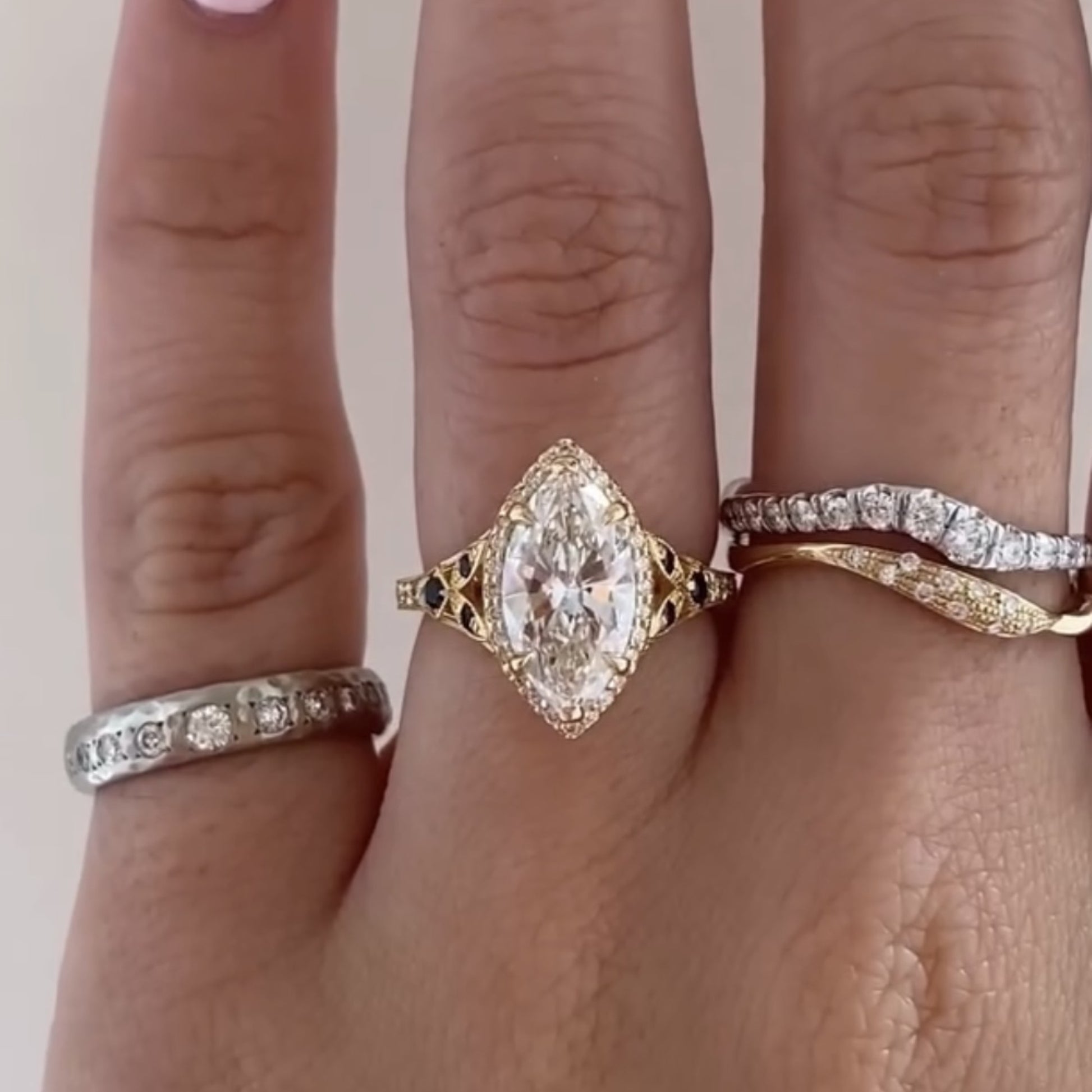 Celebrate timeless romance with this stunning 3 CT marquise-cut Lab Grown diamond engagement ring. Framed by a sparkling halo, the elongated center stone creates a graceful, vintage-inspired silhouette. Intricate detailing along the band adds heirloom charm, while solid gold craftsmanship ensures lasting beauty. Perfect as an engagement, wedding, or statement ring, this design blends classic elegance with modern sustainability for a truly unforgettable symbol of love.