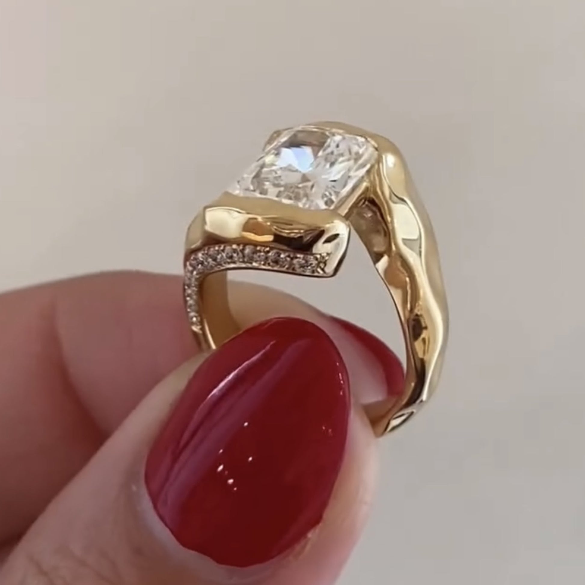 Organic Half bezel Radiant Lab Grown Unique Engagement Ring Bypass Solid Gold Wedding Ring