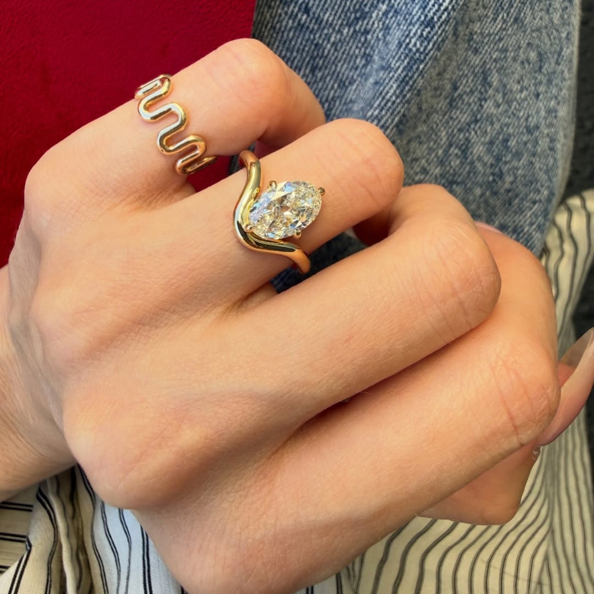 Graceful and contemporary, this ring features a luminous oval diamond cradled in a flowing curved gold band. The elegant solitaire design enhances the stone’s brilliance while creating a soft, sculptural silhouette. Perfect as a wedding ring or modern engagement ring, this piece blends organic movement with timeless sophistication. Ideal for women who love unique design, refined sparkle, and sustainable luxury crafted for everyday elegance.