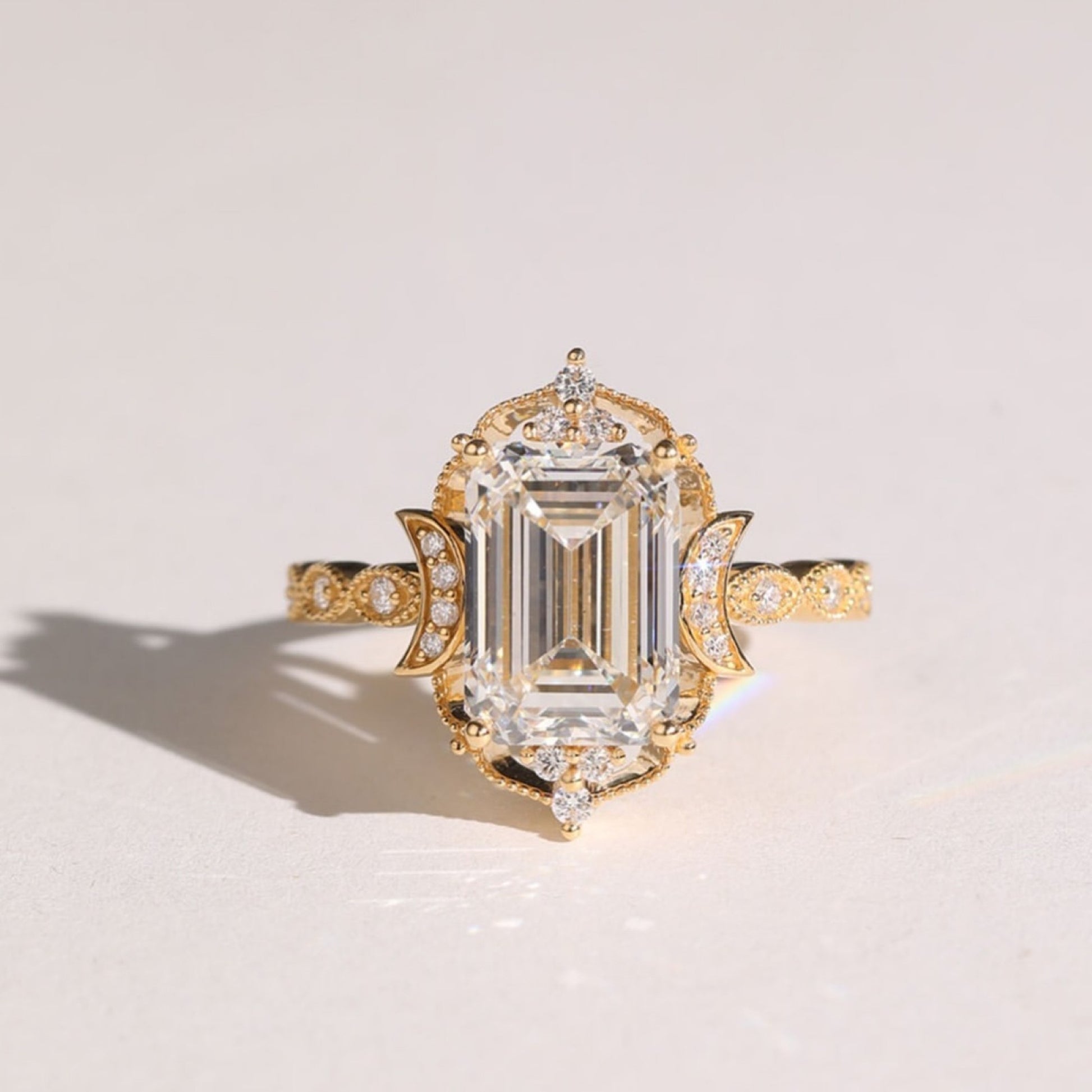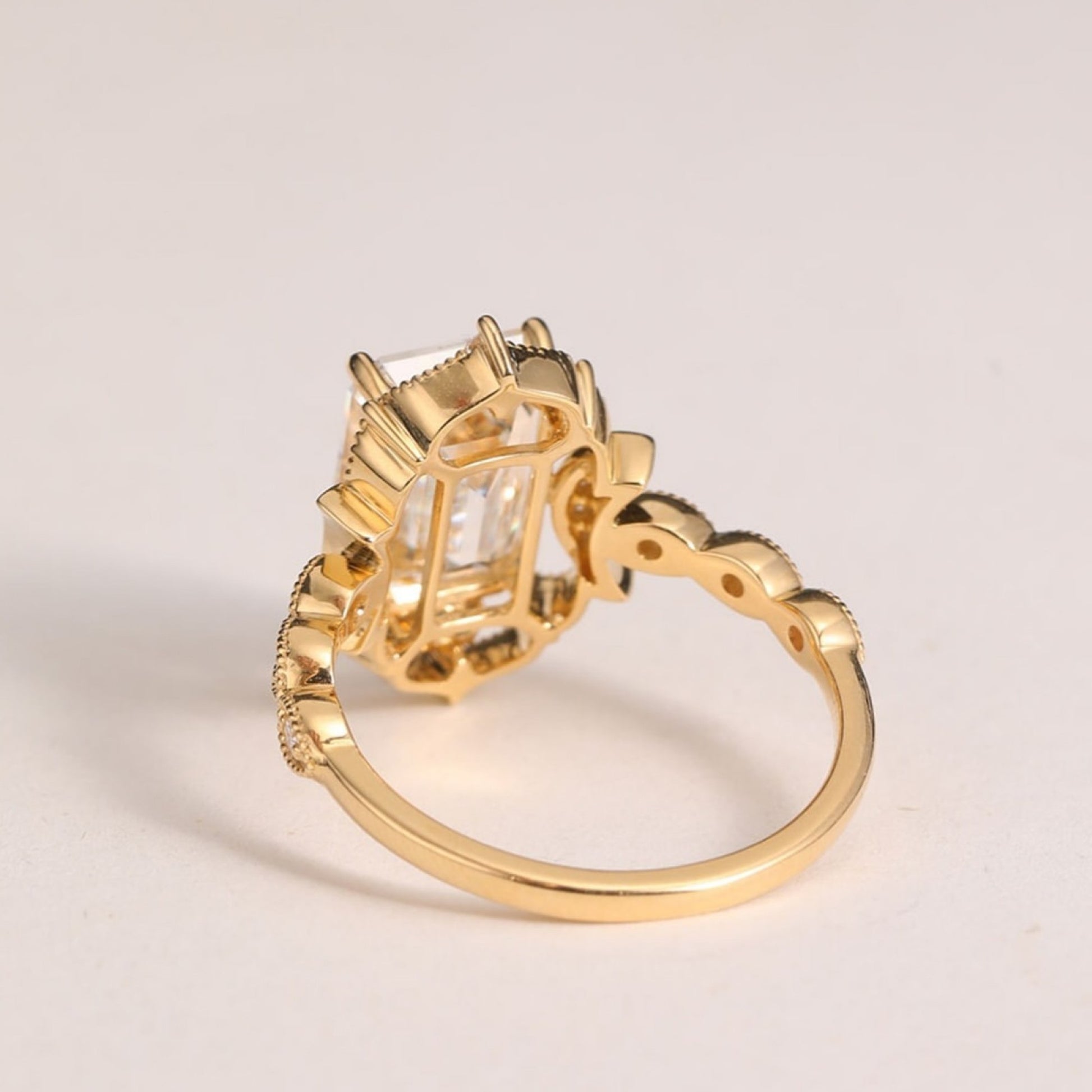 This vintage Art Deco engagement ring features a stunning emerald-cut moissanite framed by intricate gold detailing. Accented with delicate side stones and graceful leaf-inspired motifs, the design blends old-world charm with modern brilliance. Crafted in rich gold, this elegant ring is perfect for engagements, weddings, or anniversaries, offering timeless beauty, exceptional sparkle, and a luxurious heirloom-inspired finish.